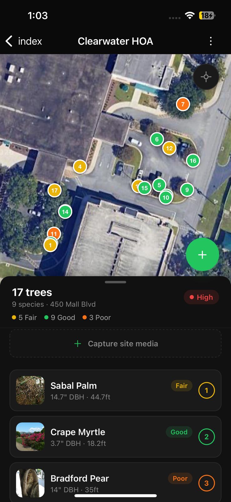 I opened the site, tapped “New Site Visit”, and started walking the perimeter. Every tap-and-hold drops a GPS pin on the satellite map. By the time I'd finished a loop around the common area, all 17 trees were pinned, color-coded by capture order, and plotted against the aerial imagery.