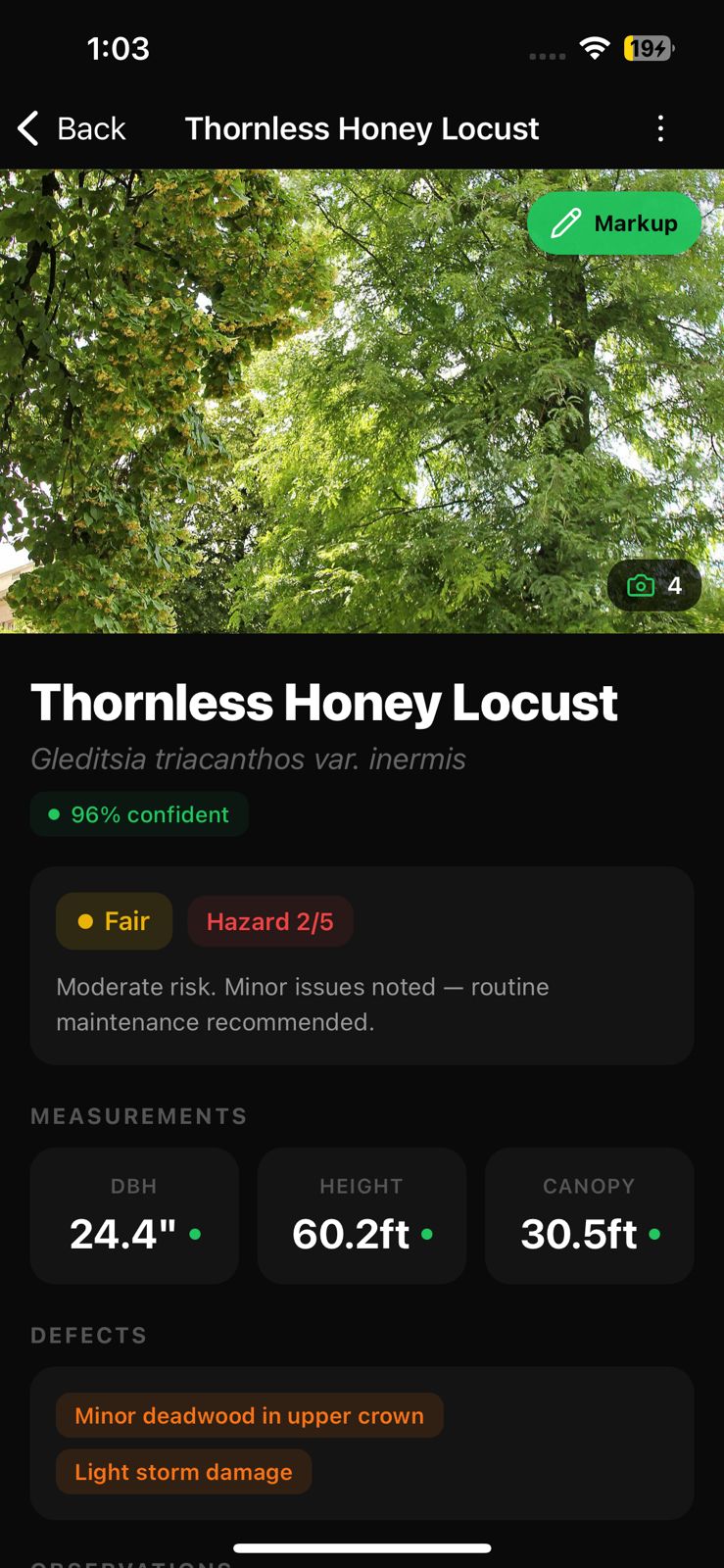 - This way: 17 trees × ~30 sec/tree = 9 min of capture. ~5 min of walking and GPS pins. ~5 min reviewing the AI output. Report generation: one tap. Total: ~20 minutes, finished on site.