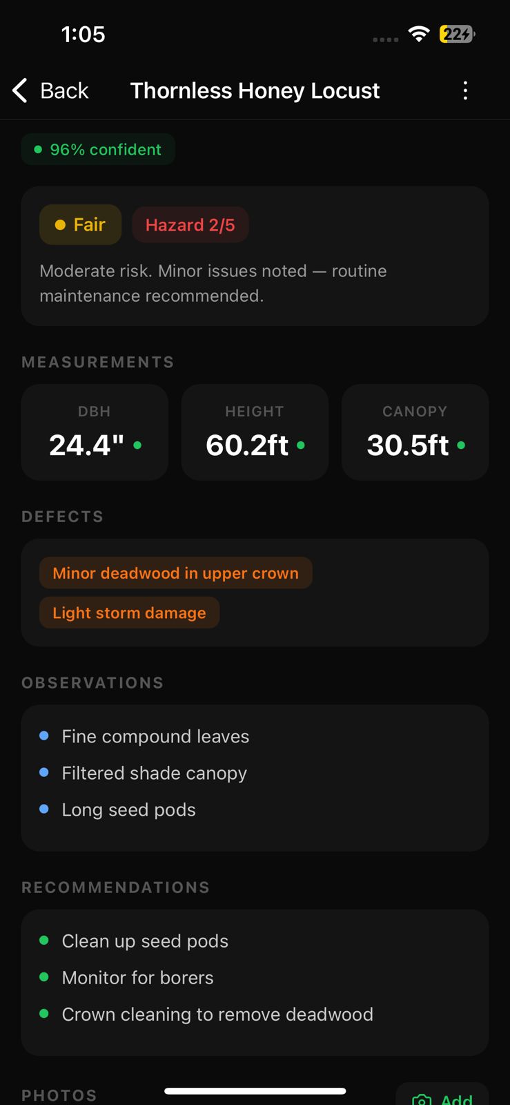 For each pin I snapped one wide shot of the tree plus a trunk close-up. That's it. The app ran each photo through vision AI and came back with species, confidence score, DBH, height, canopy spread, health grade, and a hazard rating.