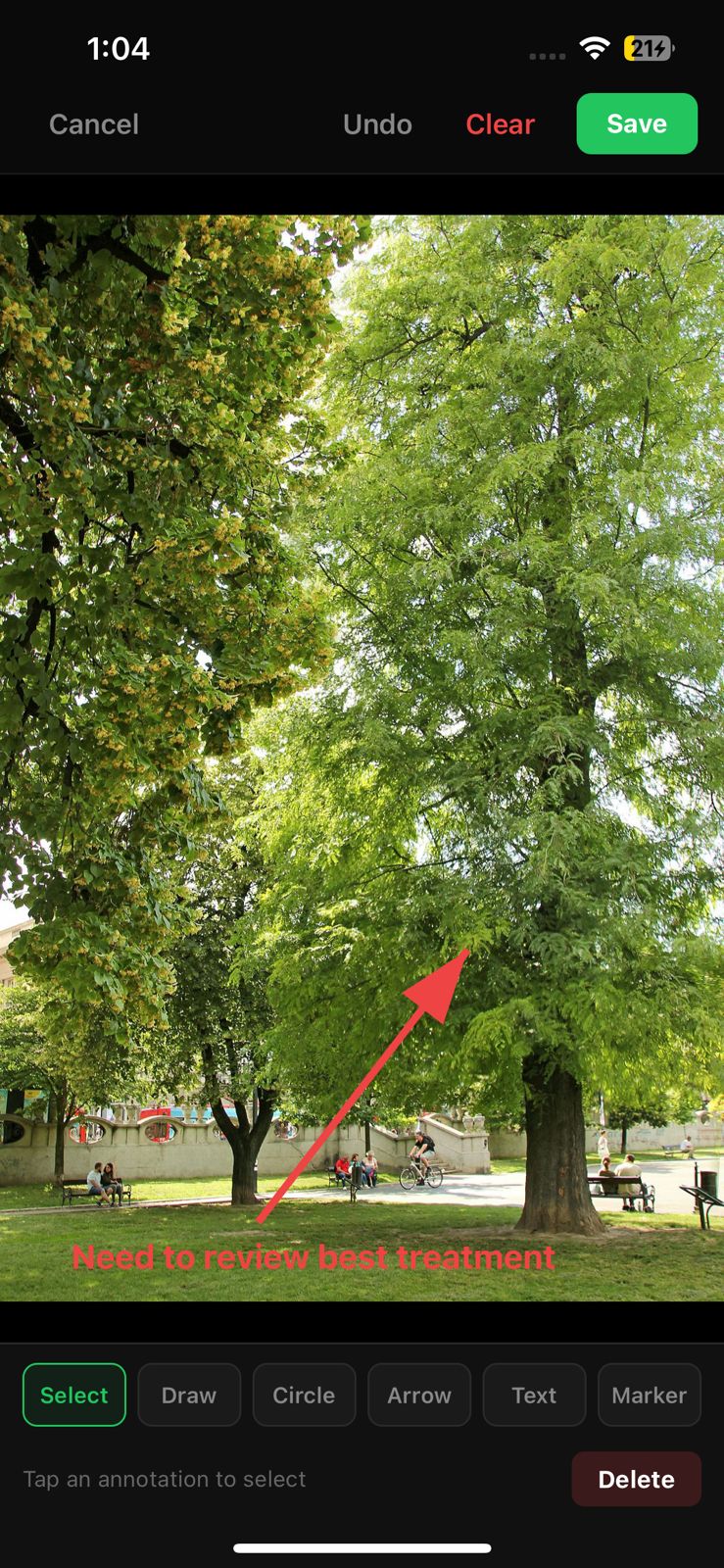 One of the Bradford Pears had a textbook co-dominant stem with included bark. I pulled up its photo, drew a red arrow at the union, and added a “needs crown treatment” label. Two seconds.