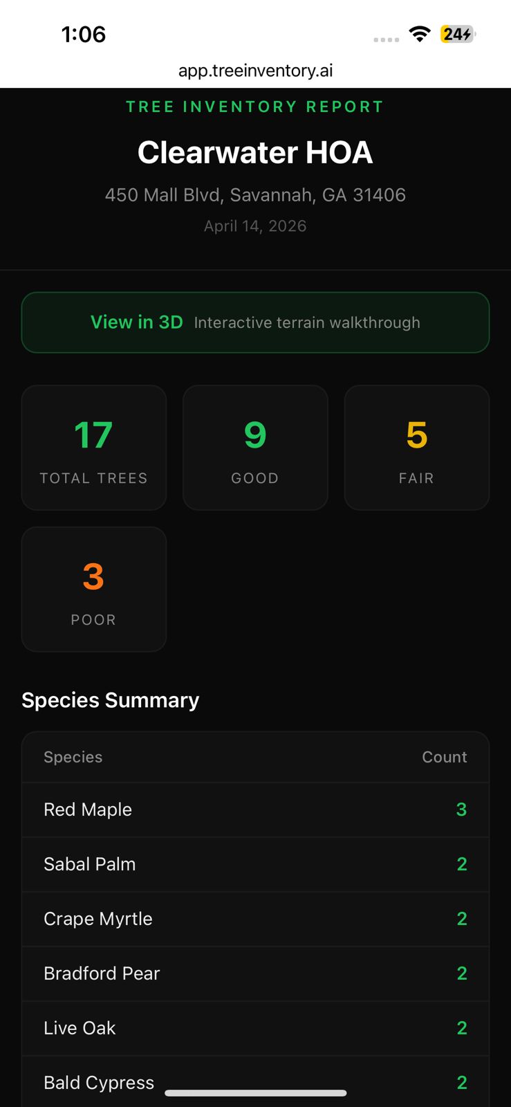 Back in the parking lot, I tapped the share menu and hit Generate Report. A full property PDF assembled itself: cover page, species summary, risk matrix, and a per-tree page with photos, measurements, and recommendations.